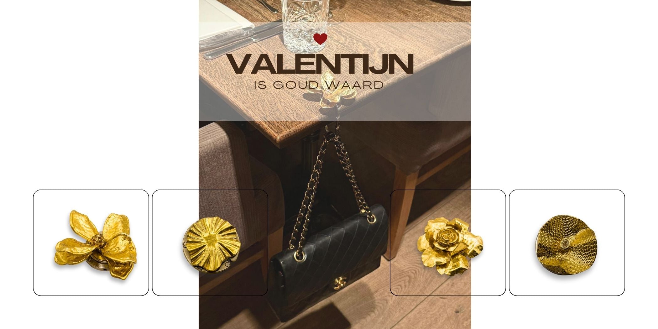 Onze luxe tashangers zijn slimme, opvouwbare haakjes waarmee je jouw tas stijlvol aan tafel hangt, geen gedoe, geen vieze vloer onder je tas.