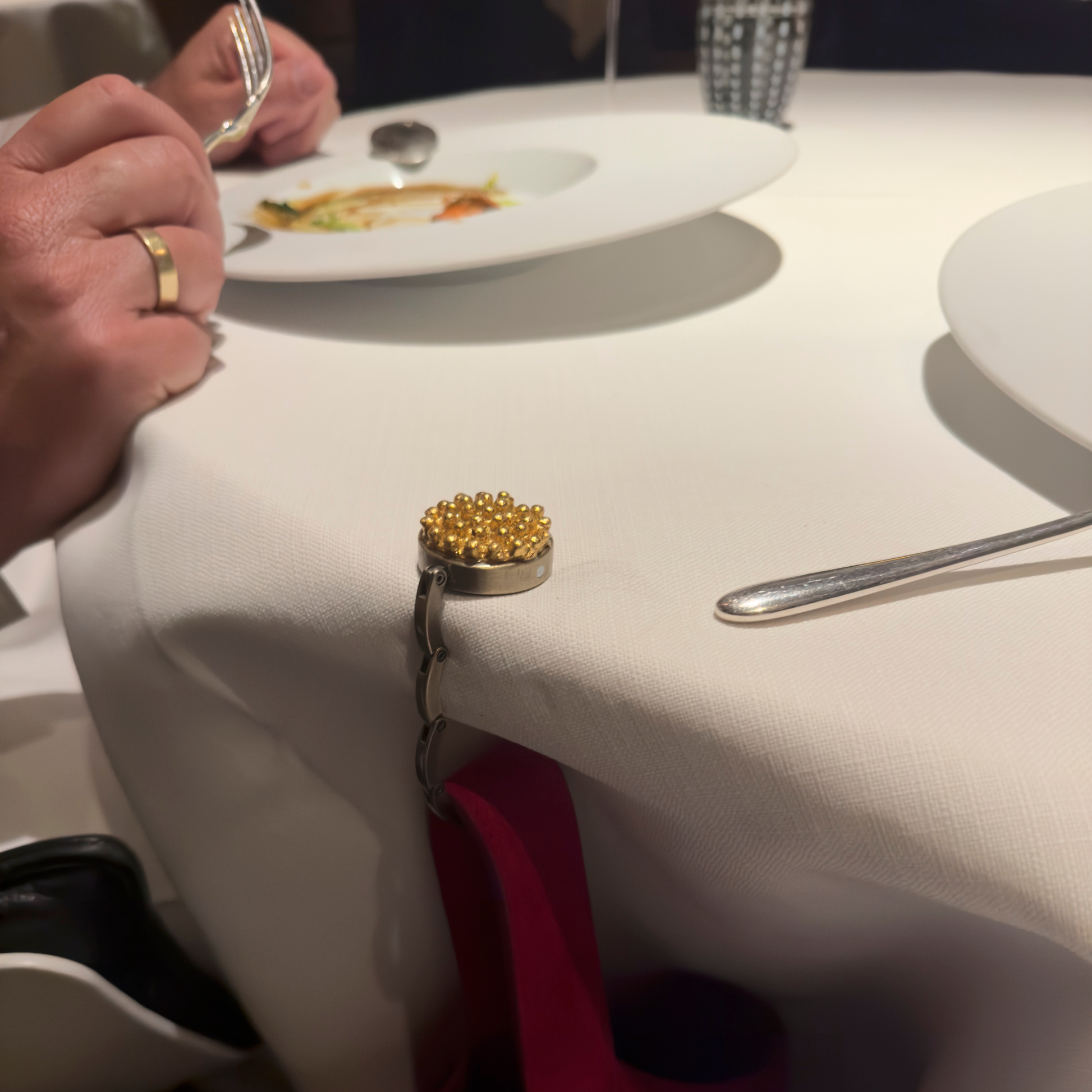 Een stijlvol detail dat een blijvende indruk achterlaat. Deze exclusieve tashanger uit de TafelDiva-collectie tilt iedere tafelschikking naar een hoger niveau. De tashanger Bubbles is ambachtelijk met 24k bladgoud vervaardigd.